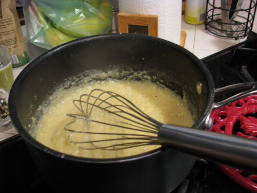 When it is just about time to eat, add in some butter (and cheese if you are like me) to the polenta and give it a final whisk.