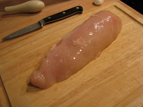 This recipe comes from my trusty "Serves One" cookbook that I love. This is a simple chicken dish that I paired with some Brussels Sprouts I steamed in the microwave. Preheat your oven or toaster oven to 450 degrees and lets get started.